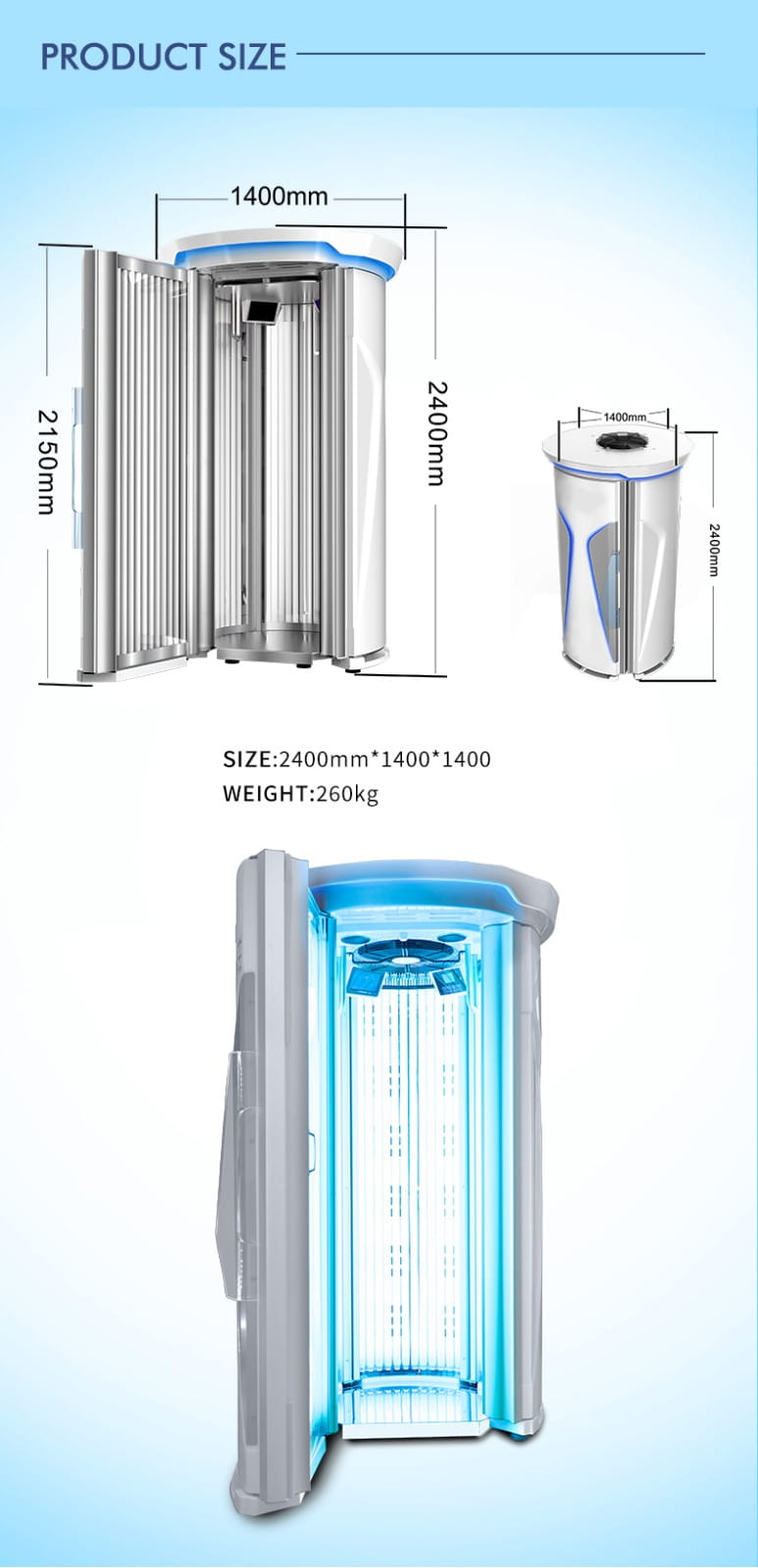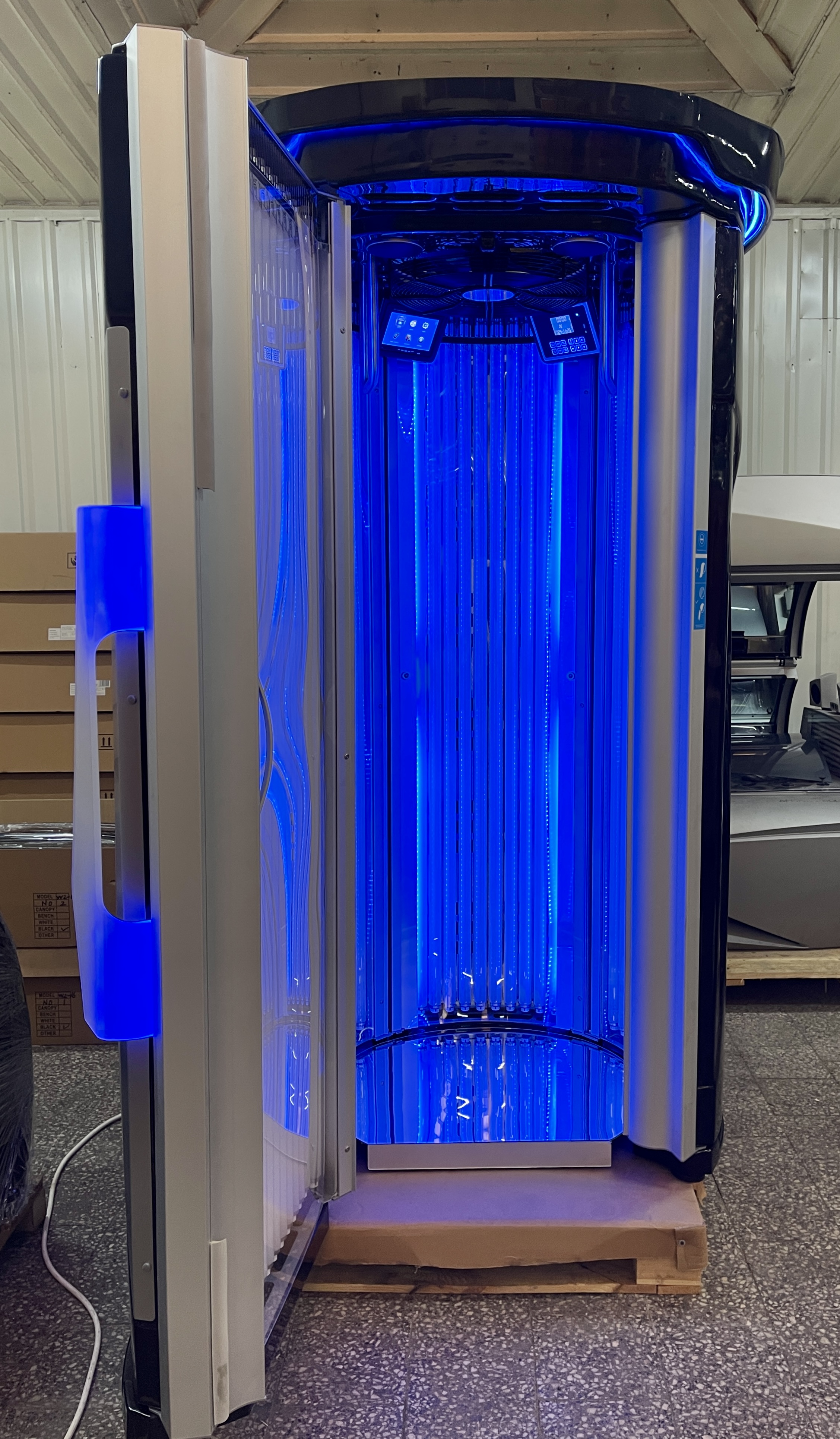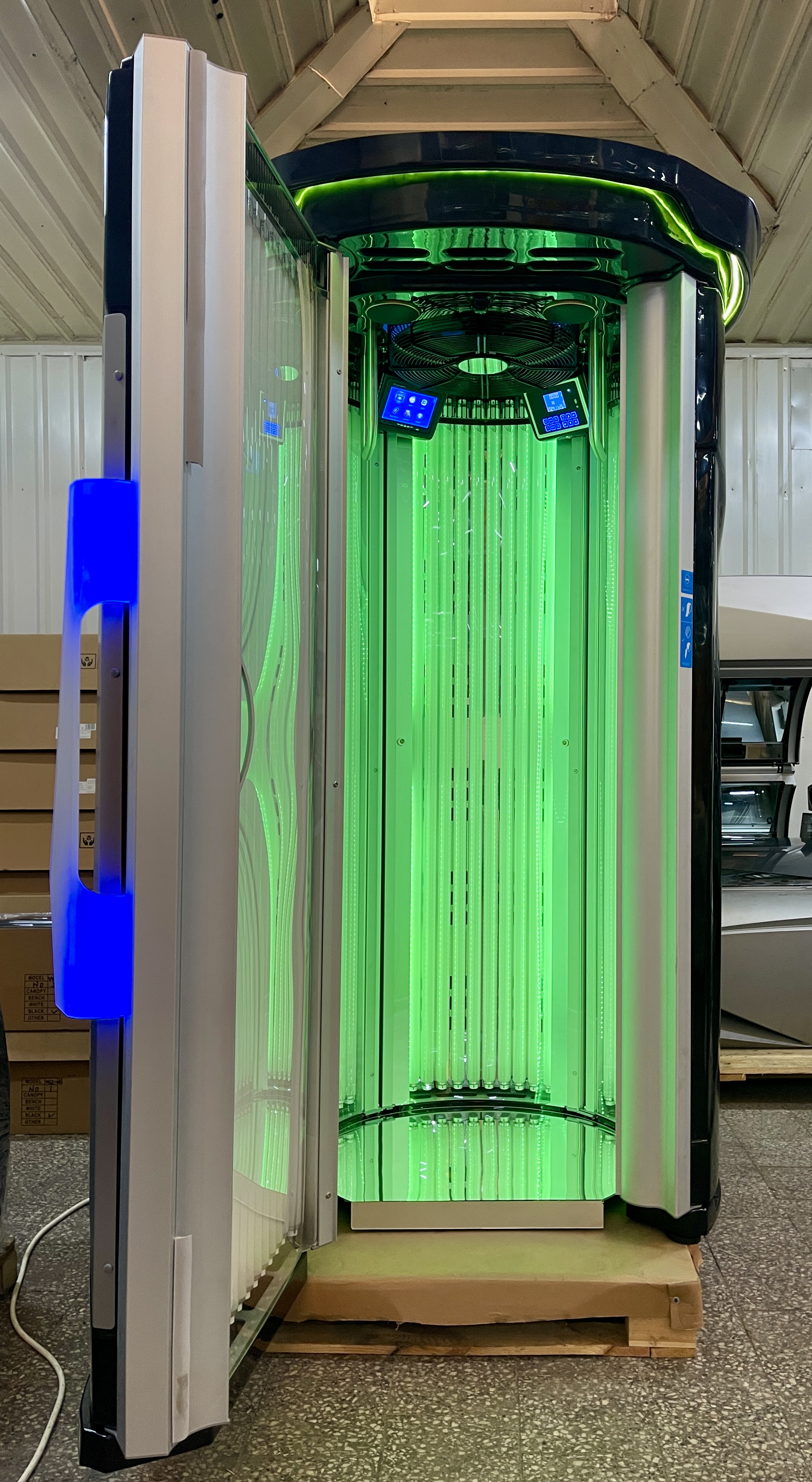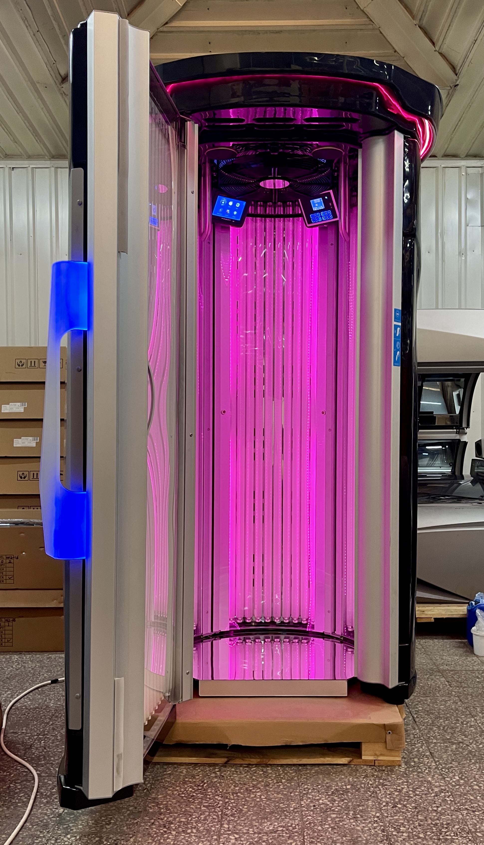 Największe urządzenie w klasie premium na światowym rynku, 54 lampy 200W. Oparte na niemieckiej technologi, idealne dla każdego, kto chce rozwijać swoje usługi w zakresie profesjonalnego opalania. Niebanalny design, cieszy oko i dodaje całemu gabinetowi elegancji. Wewnętrzny przejrzysty, łatwy w obsłudze panel kontrolny umożliwia ustawienie indywidualnych preferencji opalania. W urządzeniu zastosowano dławiki elektroniczne co pozwala na obniżenie eksploatacji prądu o 25%. Bardzo dogodnym rozwiązaniem jest bezprzewodowy sterownik do obsługi urządzenia, nie ma potrzeby stosowania dodatkowego okablowania w lokalu.